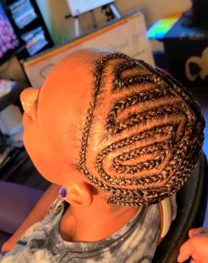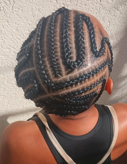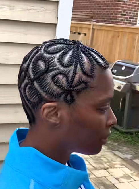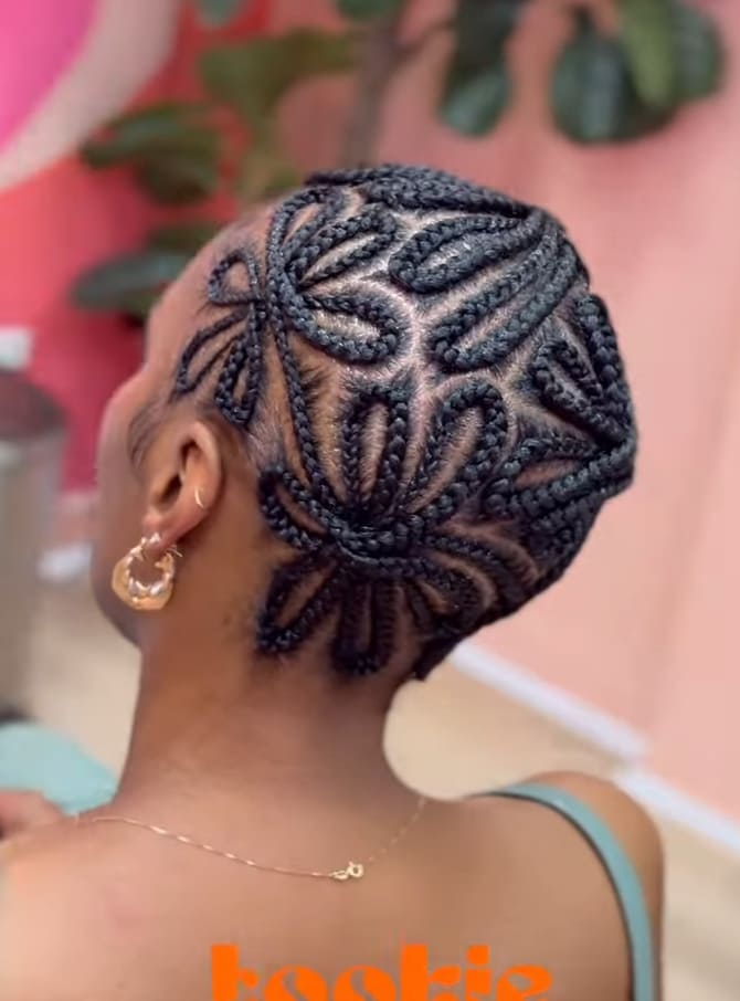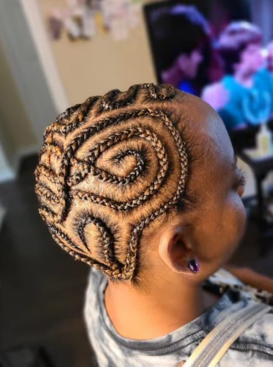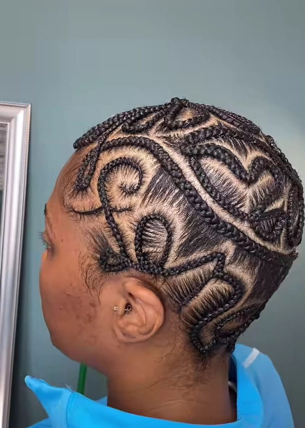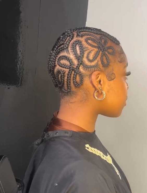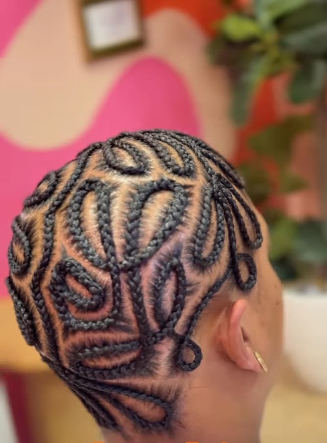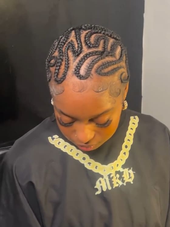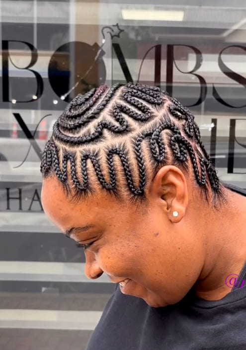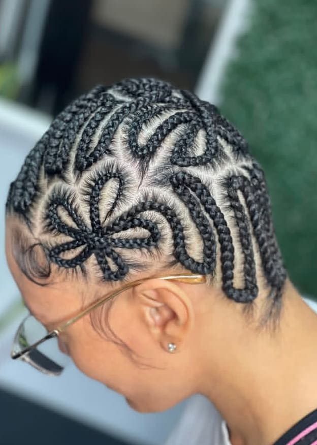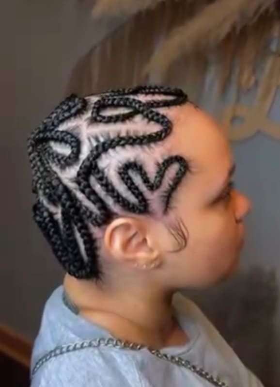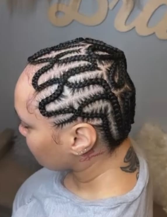 Braided baldie hairstyles usually have designs such as hearts, spirals, flowers, zigzags, stars, waves, butterflies, crisscrosses, squiggles, and more. The cornrows can also be random patterns, as long as all the hair is captured.