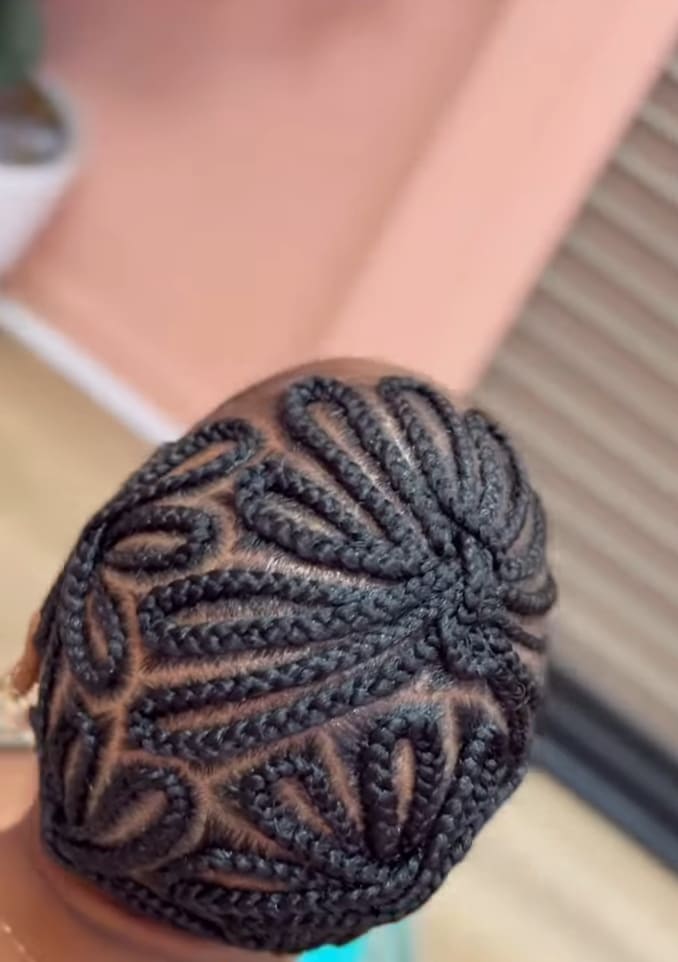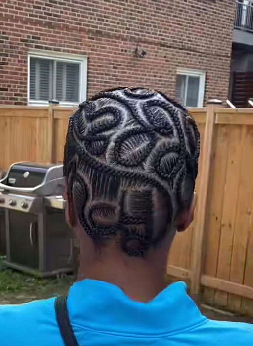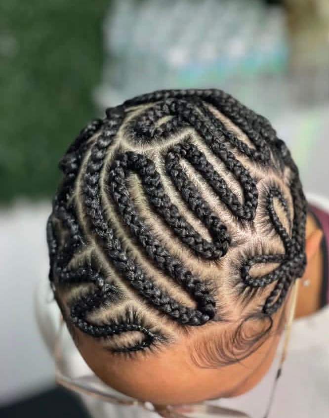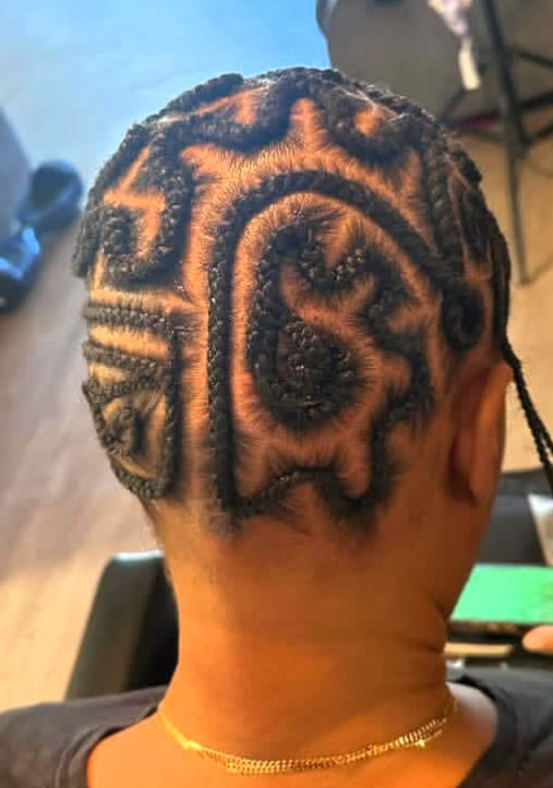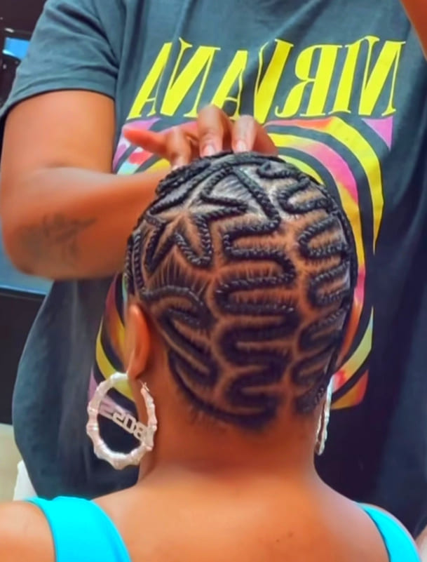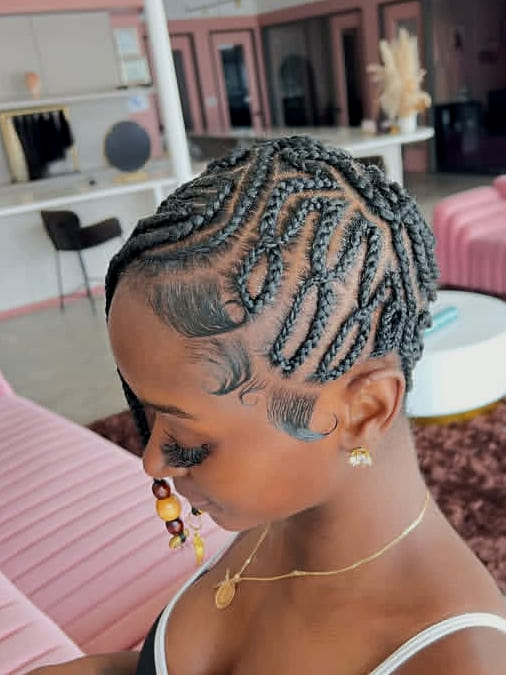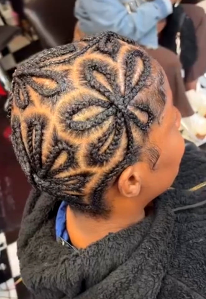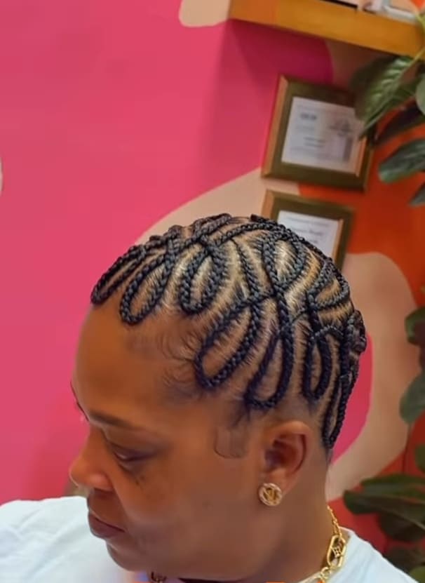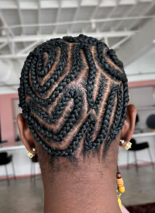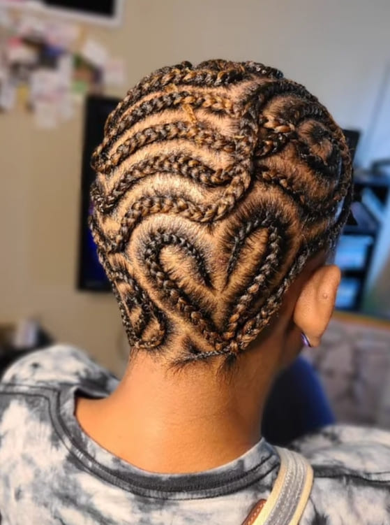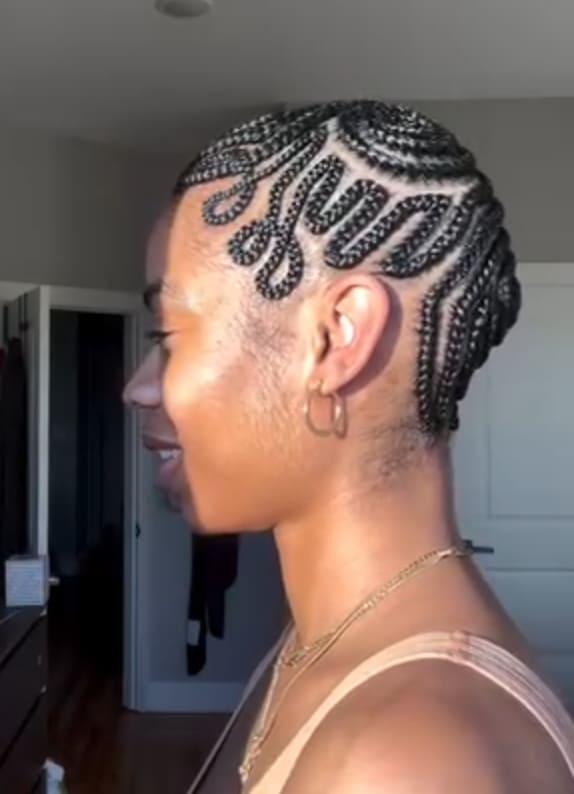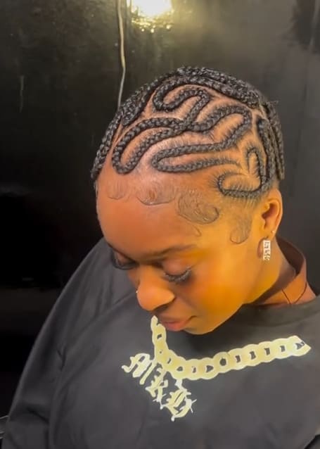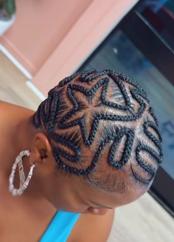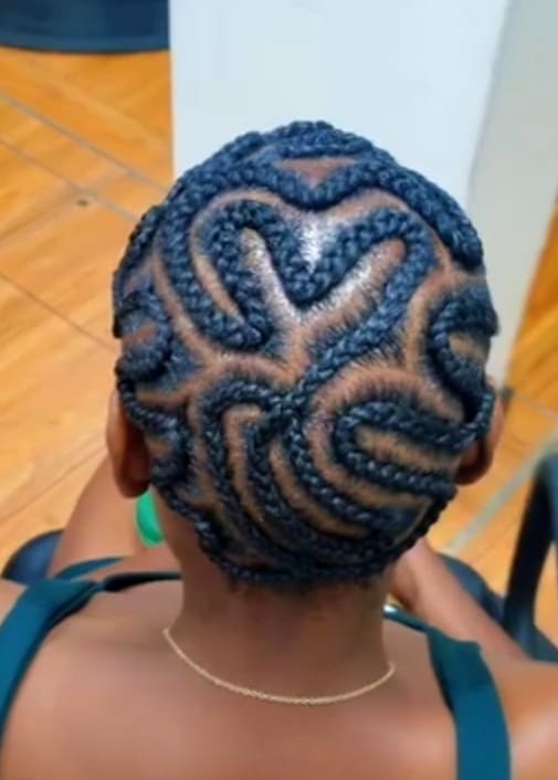 Braided baldie hairstyles usually have designs such as hearts, spirals, flowers, zigzags, stars, waves, butterflies, crisscrosses, squiggles, and more. The cornrows can also be random patterns, as long as all the hair is captured.