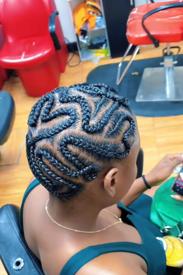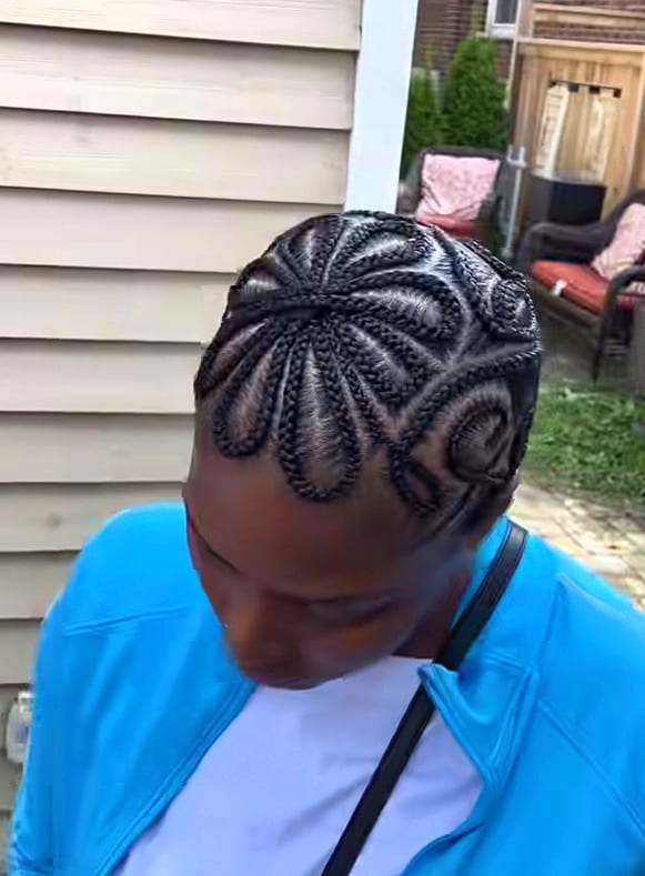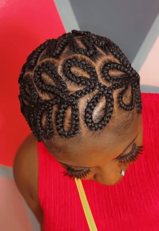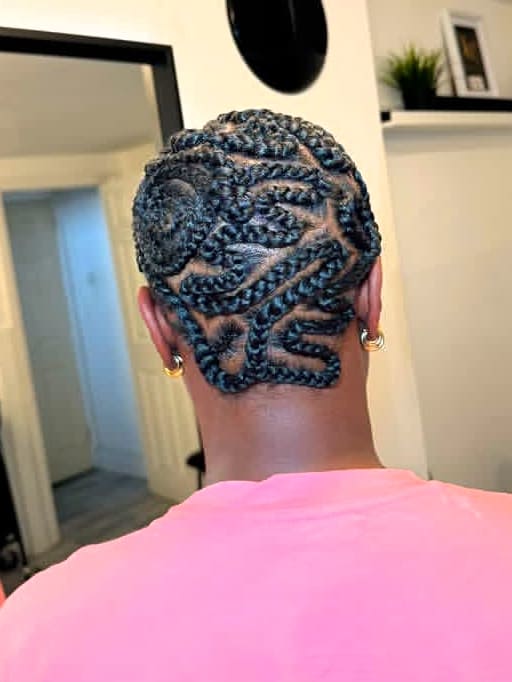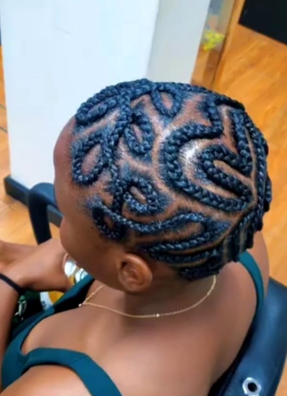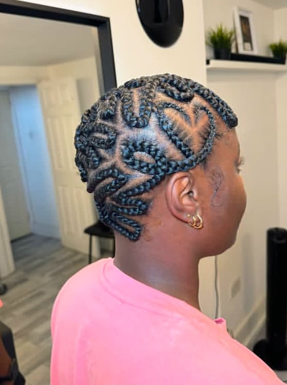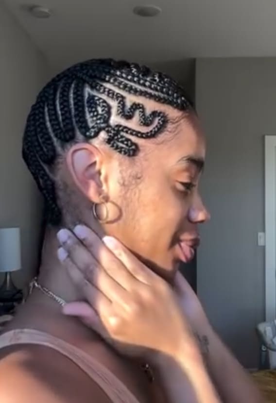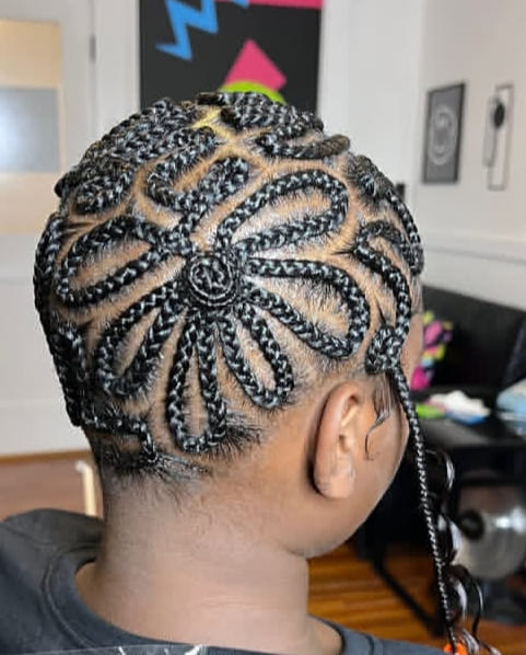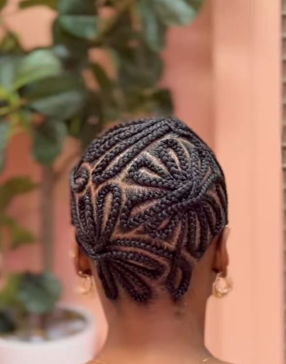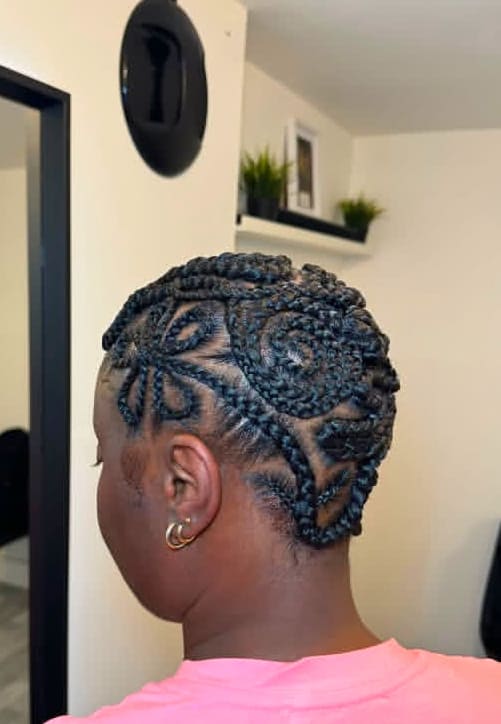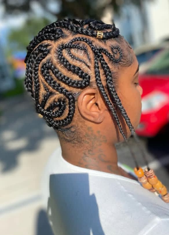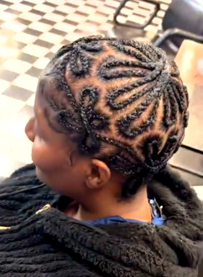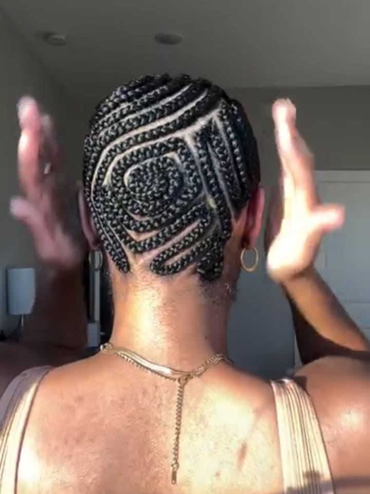 Braided baldie hairstyles usually have designs such as hearts, spirals, flowers, zigzags, stars, waves, butterflies, crisscrosses, squiggles, and more. The cornrows can also be random patterns, as long as all the hair is captured.