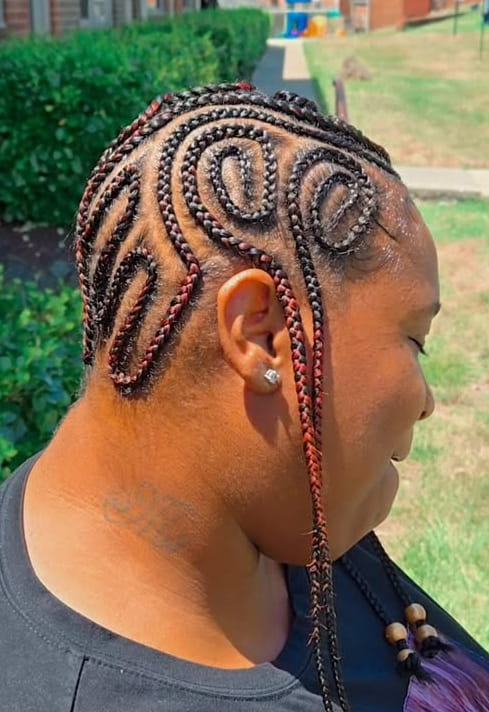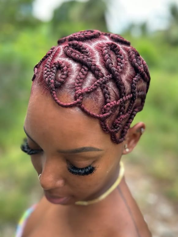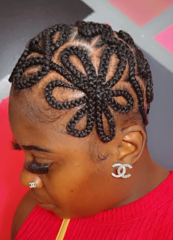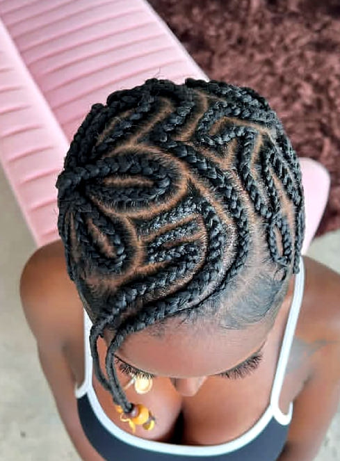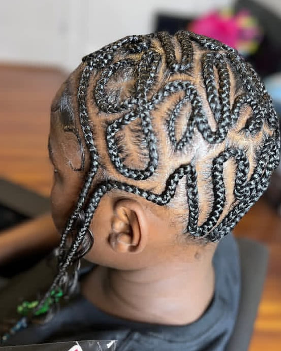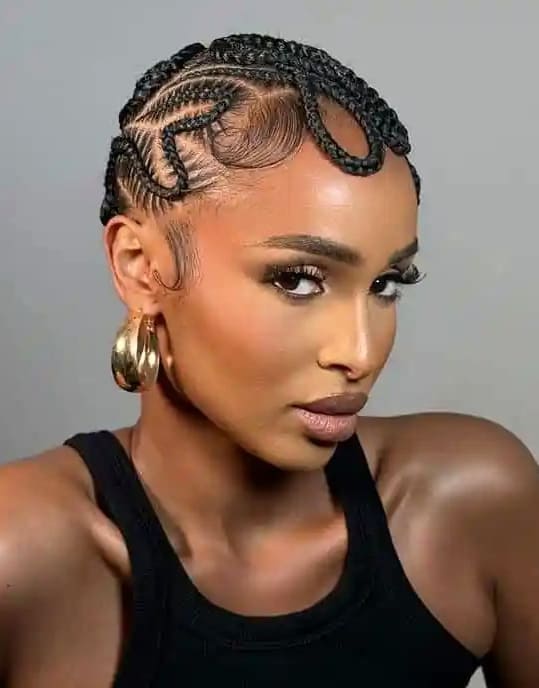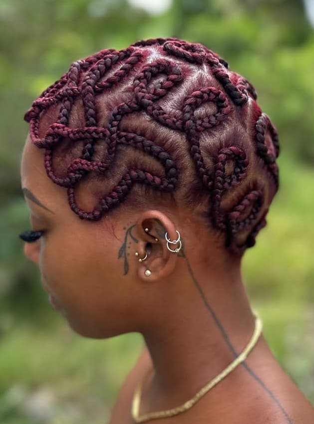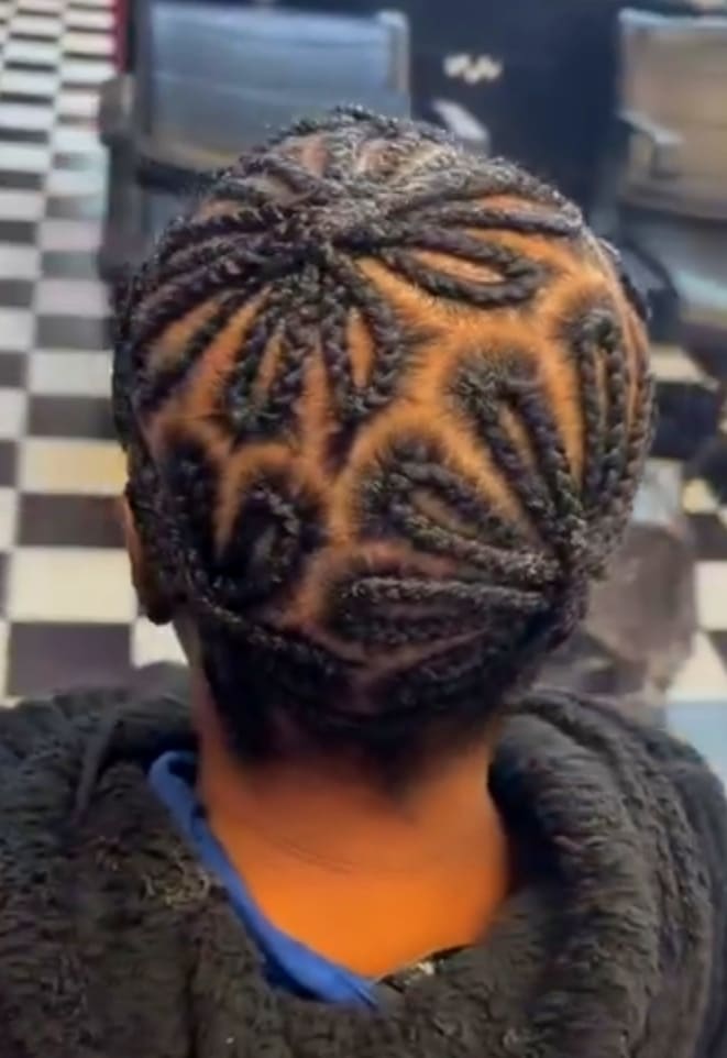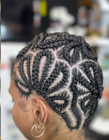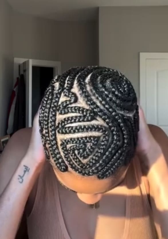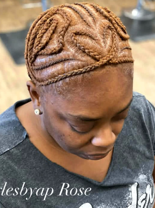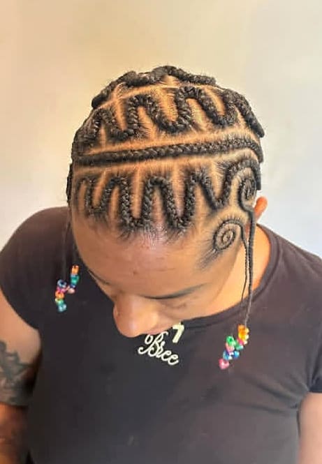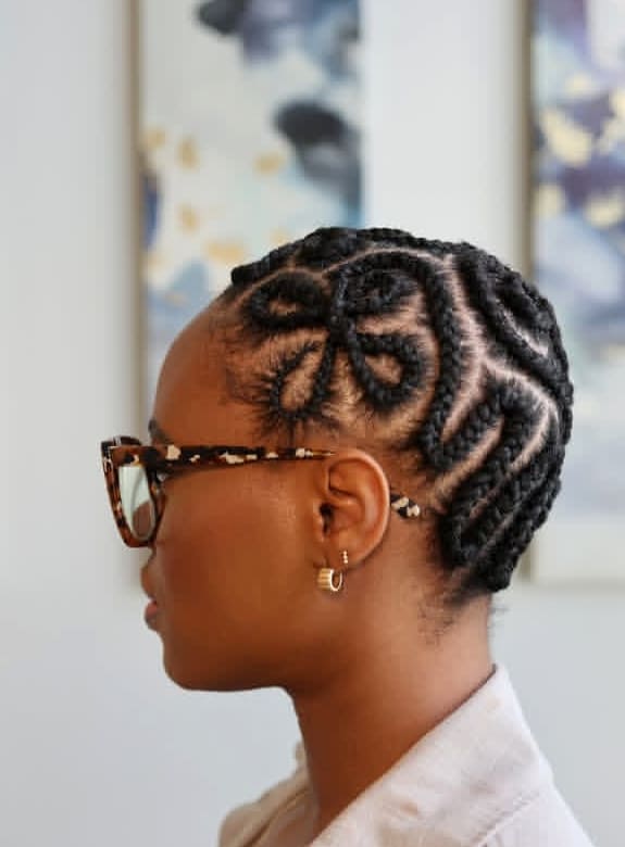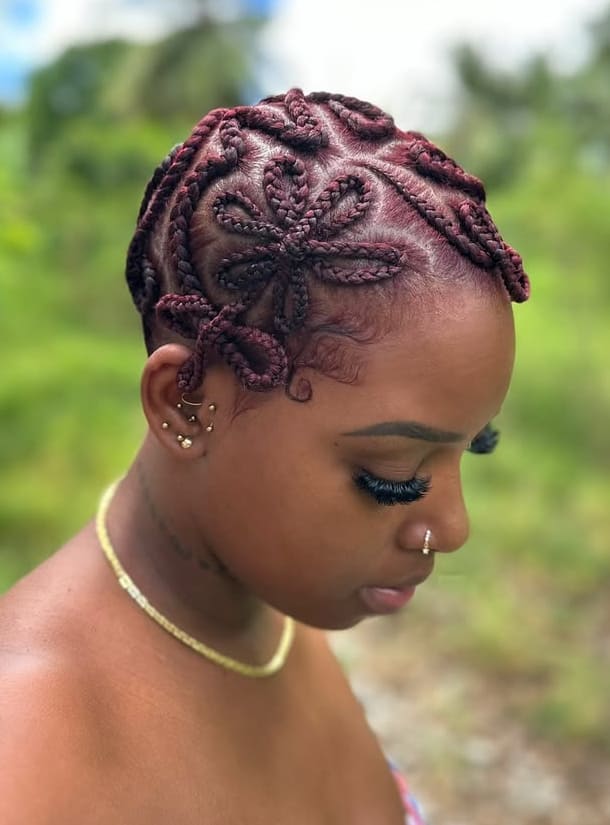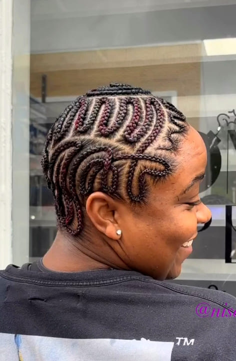 Braided baldie hairstyles usually have designs such as hearts, spirals, flowers, zigzags, stars, waves, butterflies, crisscrosses, squiggles, and more. The cornrows can also be random patterns, as long as all the hair is captured.