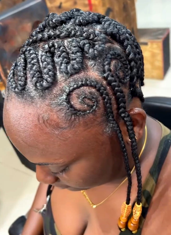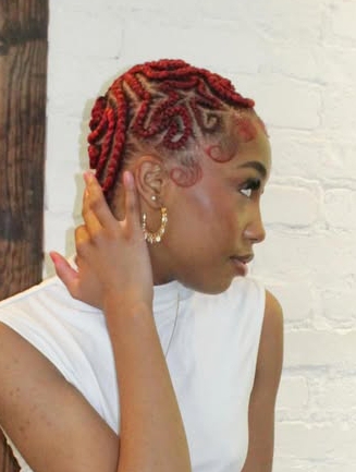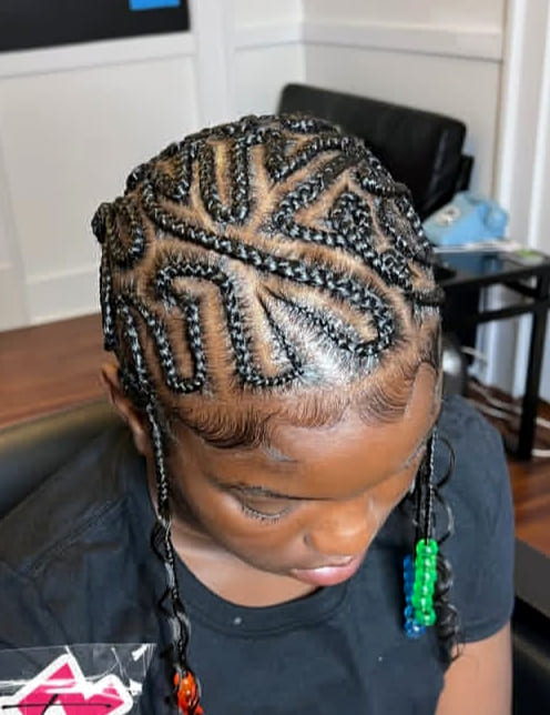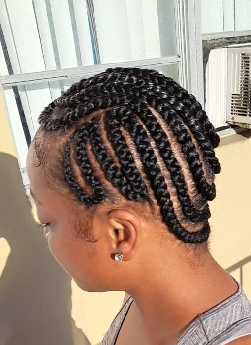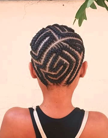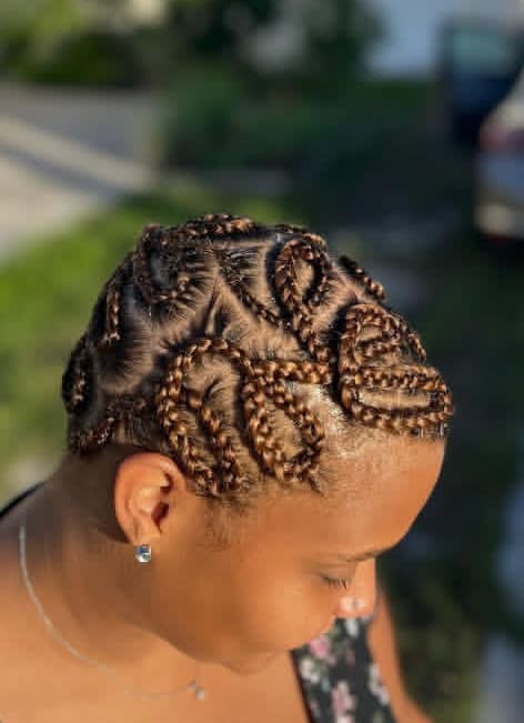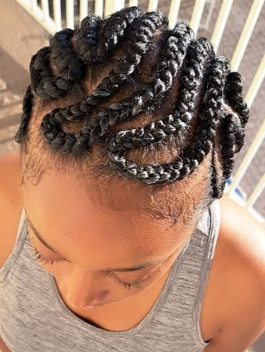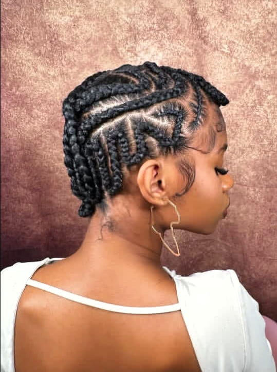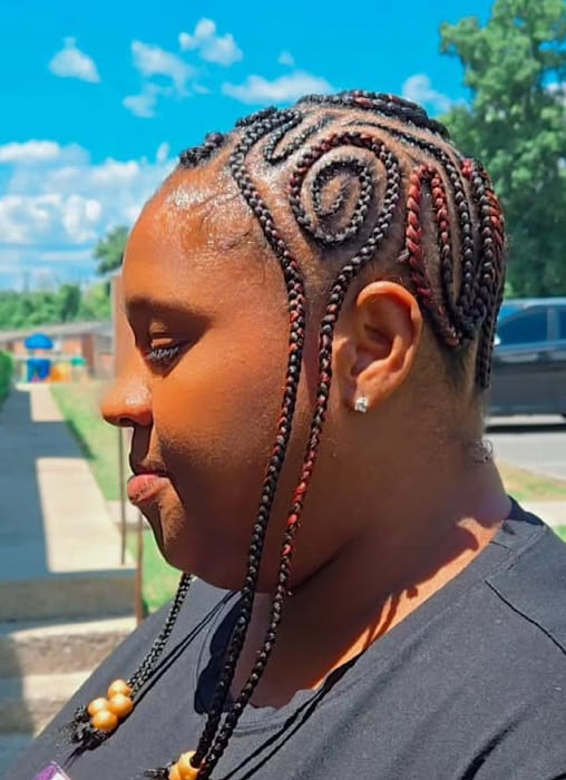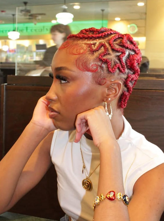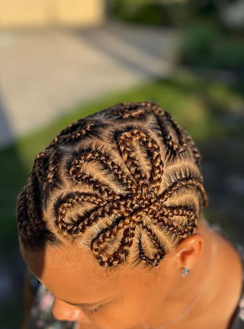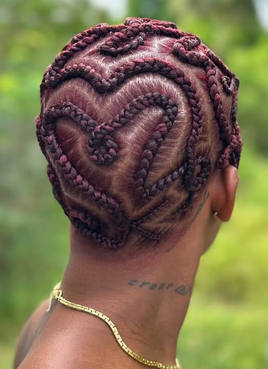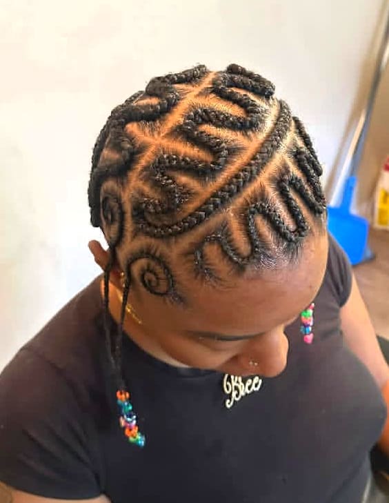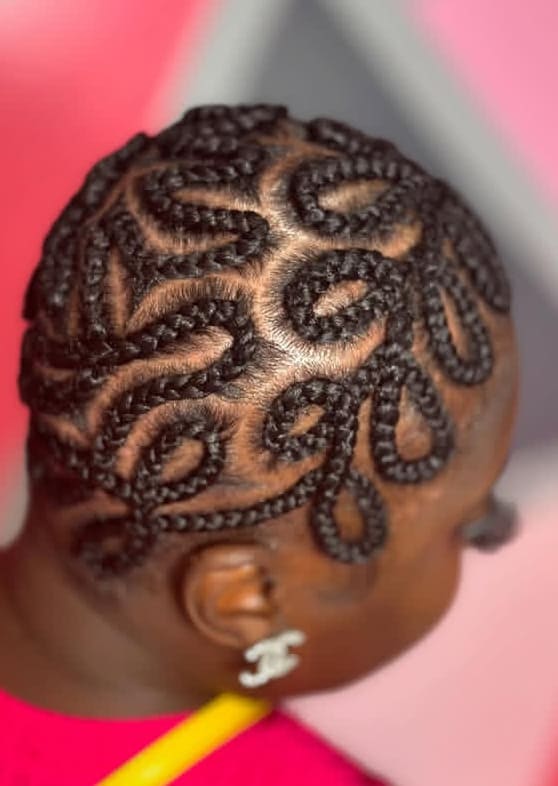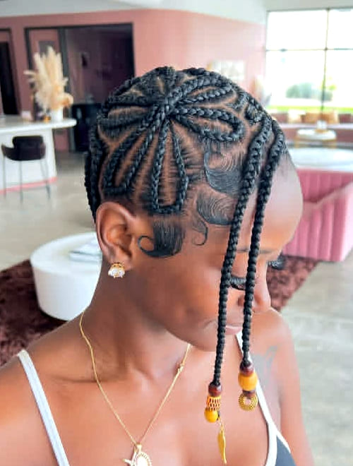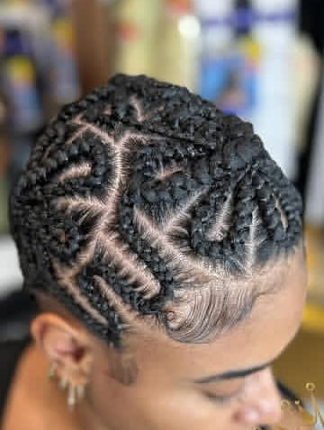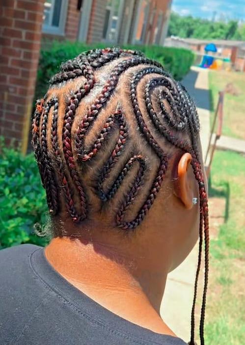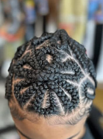 Braided baldie hairstyles usually have designs such as hearts, spirals, flowers, zigzags, stars, waves, butterflies, crisscrosses, squiggles, and more. The cornrows can also be random patterns, as long as all the hair is captured.