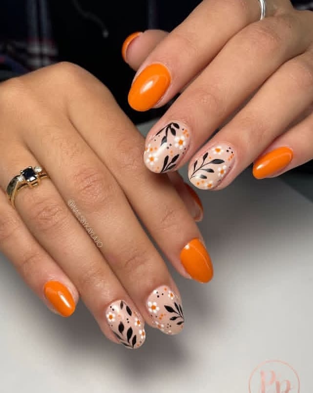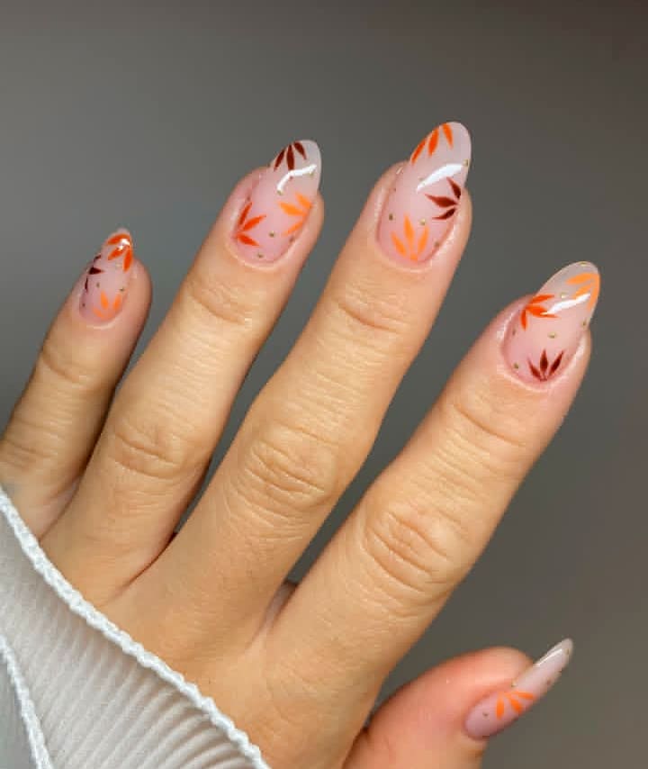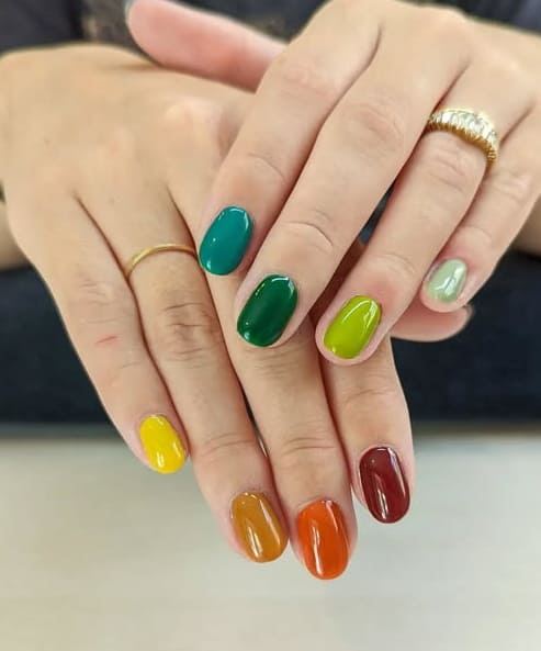 Fall-themed nails usually use shades of green, yellow, orange, red, and brown colors to represent the changing colors of tree leaves in autumn. Black and purple are also popular autumn nail colors.